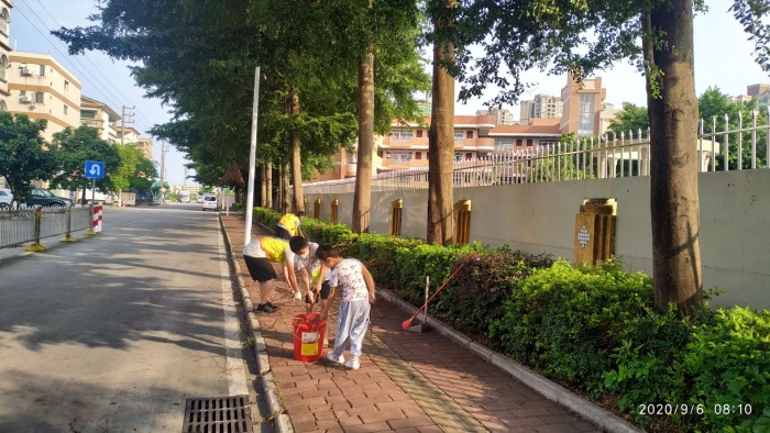 教务主任莫振佩带领部分人员负责校门口广学路的垃圾清理,主要包括移除校园周边花圃里的枯树枝,清除白色垃圾、烟头,清扫路边的树叶等,大家带齐清洁工具很快行动,个别家长志愿者也主动加入劳动队伍。德育主任许向阳带领各年级级长们对各年级的教室、走廊、厕所等卫生情况进行全面排查,对有疏漏部分立即处理。德育主任梁超胜负责厨房的卫生检查以及校门口、班级、校车上疫情防控物资的落实,如人体测温仪、消毒液、防护口罩等。校长黄飞跃负责张贴校门口“一米间隔”防控标识和宣传标语。经过一个小时的奋战,自查整改工作初步完成。