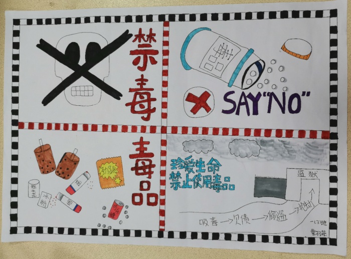 随后两天,学生独自进行了禁毒绘画创作,在此绘画创作过程中,学生加深了健康观念的意识,如拒绝接受陌生人的“馈赠”、不盲目追赶时髦、不要轻信他人、远离易染毒场所等等。通过禁毒绘画作品,不难发现,学生们以自己独有的视角和笔触,描绘了“珍惜生命、远离毒品”“无毒青春,健康成长”“禁毒与天使牵手,吸毒与魔鬼亲吻”等等主题的画作,一张张禁毒作品寓意深刻,别出心裁,蕴含着“小画家”们对毒品的独特认识和拒绝远离毒品的决心。