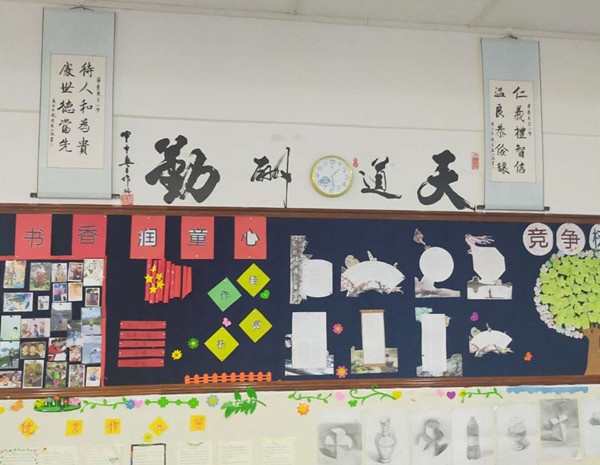 新学期伊始,该校班主任和全体学生对教室班级文化进行精心设计与文化布置。该校各班制定了富有特色的班风、班训、班主任寄语等,根据实际还增设了一些有特色的栏目。比如,公告栏、时事栏、诵读栏、手抄报等。把“美”的教育渗透在班级文化的各个方面:在墙面上还设置了“小小书法家”“小小画家”、“每周一星”“我真棒”、“学习园地”等区域,做到了让“每一堵墙”成为“无声的导师”。通过一轮的评比,每个年级都评出了一个一等奖、两个二等奖和若干个三等奖。最后把文化凸显的三个优秀班级参加区级特色班级评选候选:分别是六(4)班、六(2)班和二(1)班。