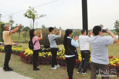 11月23日,小榄菊花会期间,游客在菊花园内游玩。遇见美景,大家同时拿出手机拍照。本报记者 王云 摄