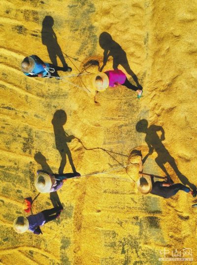 7月2日,一批农民在晒谷场翻晒稻谷。2020年6月下旬至7月上旬,中山市南朗镇崖口村夏粮喜获丰收,全村农民不畏酷暑,头顶烈日在晒谷场上铺开谷子、隔时翻晒,呈现一派忙碌的景象。金灿灿的谷子是底色,烈日当头下的人和影是诗行,一幅美妙的图画定格在低空俯拍的无人机的镜头中。 本报记者 文智诚 摄