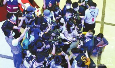 7月17日,第四届海峡两岸中山论坛在中山市开幕,论坛以“弘扬中山精神、共谋民族复兴”为主题。开幕式后,参加论坛的嘉宾被众多媒体记者围住采访。本报记者 文波 摄
