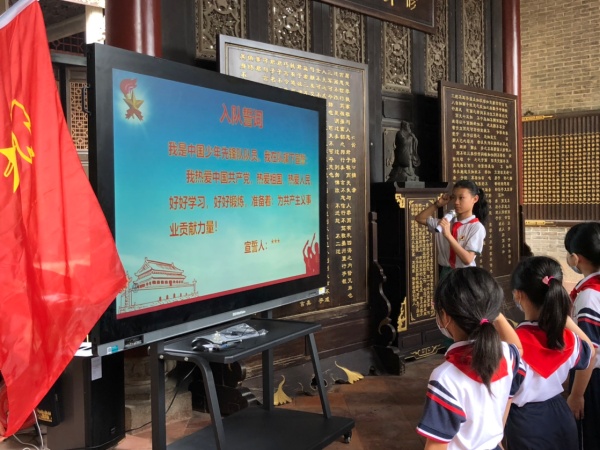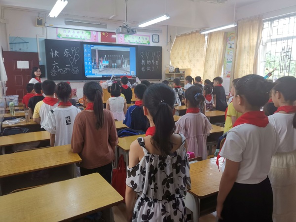 此次活动在线上线下同时进行,入队队员及六一中队在书院进行入队仪式,其它中队在教室观看仪式直播。伴随着激昂的出旗曲,一年级入队仪式在全体队员的期盼中拉开序幕,队员们齐唱《中国少年先锋队队歌》。接着,大队辅导员罗永德宣布了新队员名单,并对新入队的队员表示热烈祝贺。