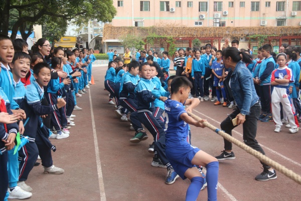 下午是紧张的集体比赛项目,项目分别为四至六年级的拔河比赛,一至三年级的50米迎面接力,1分钟集体跳绳和二人三足迎面接力。在拔河项目和50米迎面接力赛中,体育场上响起了此起彼伏的加油声。运动员们为了集体荣誉奋力拼搏,场下的拉拉队员们扯着嗓子呼喊,仿佛能通过这种方式给予同伴力量,集体团结的力量在这一刻得到彰显;在二人三足迎面接力比赛中,小小同伴互相鼓励,互相喊着口号“一二,一二,一二……”迈着整齐的步伐,低年级的弟弟妹妹努力平衡身体,培养与同伴的默契,高年级的哥哥姐姐们早已熟练掌握,健步如飞;在一分钟集体跳绳中,每位同学都在努力为班上积多一分。