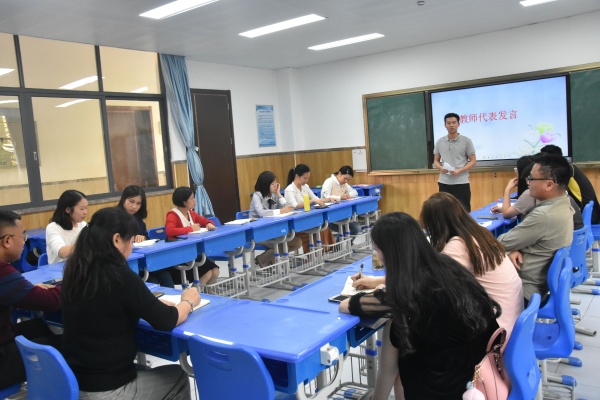 该活动由付碧玉老师主持,首先由郭梓健老师作为教师代表进行发言,郭老师从融入学校环境,结合自身职业评价定位,分享了入职五年以来个人的成长收获。他表示要多向同行、多向专家交流学习,多参加学校各项活动,要认真把当前事情做好做细并且做长远。其次是教师代表黄海韵老师发言,她主要结合自身这十年里的工作经验与成长,从立志 学习 机遇 实践 总结 五方面谈自己的收获,她提到,要懂得抓住机遇,创造机会锻炼自己,要有终身学习的精神。