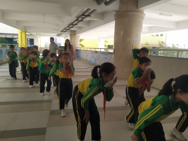 上午9时40分,西区广丰小学警报声响起后,老师们迅速做出反应,在各自负责的位置引导学生疏散。学生们在老师的带领下,用湿毛巾或用手掩住口鼻、弯腰伏背,按照事先设定好的逃生路线,快速、安全、有序地撤离教学楼。