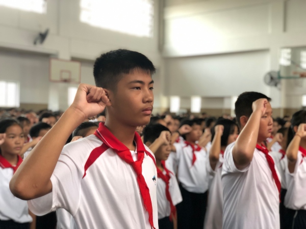 最后,在大队辅导员蔡洁莹老师的带领下,同学们举起右手,庄严宣誓:“我是中国少年先锋队队员,我在队旗下宣誓……”同学们激情澎湃,响彻校园的呼号声和歌声彰显着每一位中山一中西区中学少先队员励志学习、成就自我的决心。