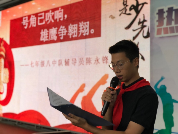 少先队中队辅导员陈永锋老师发表主题为“号角已吹响,雏鹰争翱翔”的讲话,陈老师讲到2019 年是重大节日、纪念日较为集中的一年,五四运动 100 周年、新中国成立 70 周年、少先队建队 70 周年等时间节点使得青少年思想政治引领工作更显重要,学校少工委以今天的“号角已吹响,雏鹰争翱翔”主题活动为契机,增强少先队员光荣感,帮助中学少先队员快乐度过这承上启下的重要人生阶段,为广大少先队员的健康成长和全面发展保驾护航。他叮嘱并激励着少先队员们应时刻准备着,为实现中华民族伟大复兴贡献力量!