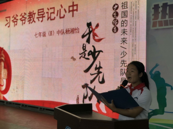 在充满朝气和活力的中国少年先锋队队歌的歌声中,仪式拉开了帷幕。优秀少先队员代表杨湘怡同学发表主题为“听习爷爷的教导”讲话,她表示将把习爷爷在爱国、立志、学习等多方面的寄语牢记于心,时刻勉励自己和身边的同学,践行社会主义核心价值观,“热爱党、热爱祖国、热爱人民,努力成长为有知识、有品德、有作为的新一代建设者,准备着为实现中华民族伟大复兴的中国梦贡献力量”。在今后的学习生活中将用自己的实际行动,向祖国、向学校、向家长交一份满意的答卷。