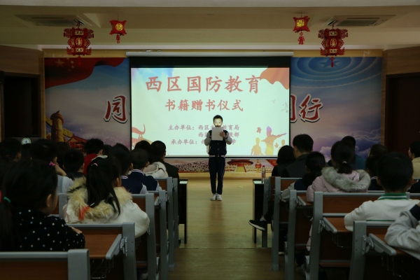为提升西区中小学生国防意识,加大国防教育宣传力度,12月5日下午,西区文体教育局联合西区人民武装部在西区铁城小学报告厅举行了国防教育书籍赠书仪式。西区党工委委员陈飞国、武装部王龙珠副部长、教育事务指导中心刘海英副主任、德育专干苏文森、铁城小学侯洁校长以及西区各校德育副校长(或德育主任)出席活动,铁城小学约200名学生一同参与赠书仪式。