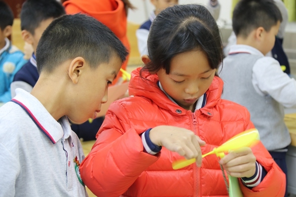 12月3日、4日,学校分别举行了一二年级橡皮筋动力直升机年级竞赛。在竞赛活动中,学生自主制作飞机,并放飞了自己的制作成果,展示了自己的研究成果并获得了在场同学的阵阵掌声。在一二年级各班教室,小朋友们利用各种废旧材料制作的小盆栽,创意的手工搭配绿色的植物,映衬着同学们花朵般的笑脸,教室里显得更有生机。