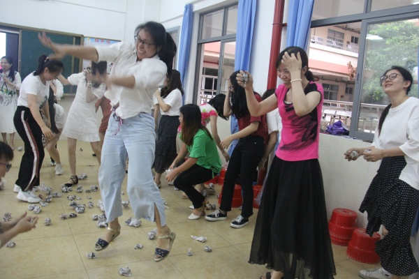 在 “纸团大战”中,大家更是把种种压力、不良情绪都化作一个个废纸团,扔向远方,也可以把纸团看作爱,把爱送出去,收获更多的爱,老师们全身心都得到了放松与释然。