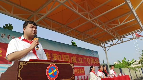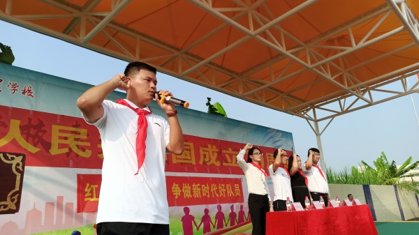 在张馨彤队员的指挥下,全场所有人员进行了唱队歌活动。大队长张若诗带领全体队员重温入队誓词。聚星学校少工委副主任张帅校长和聚星学校大队辅导员谭治伟老师分别进行了队旗下讲话。少工委副主任张帅校长首先给现场全体少先队员致予了节日的问候,随后他告诫所有队员和辅导员们,要不忘初心,牢记使命,今天幸福美好的生活是前辈用鲜血和生命换取回来的,要爱护红领巾,爱护队旗,从小立志做个有用之才,长大要投身到祖国需要的地方,去建设国家,去回馈社会。辅导员谭治伟老师则告诉所有队员:少先队经历了70年的风风雨雨,从当年的劳动童子军到今天的少年先锋队,几十年的风雨历程,这个光辉的组织始终跟着中国共产党,与祖国同呼吸,共命运。希望广大少先队员好好学习,好好做人,从讲礼貌、爱护花草、爱护公共物品等小事做起,让鲜艳的红领巾永远飘扬在心中。最后,伴随着“时刻准备着!”呼号声,活动落下了帷幕。