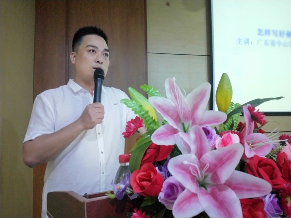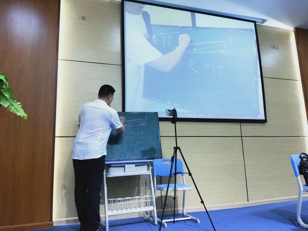 萧老师从书法基础知识拉开讲座的序幕,从书法的笔法、结构、规律做了细致的阐释,重点指导了汉字的基本笔画及结构规律。在黑板演示握笔、落笔、起笔、运笔、收笔的要领,深入浅出地向老师们讲解了基本笔法、间架结构的书写要领。萧老师利用自己扎实的书写功底为全体教师进行了很好的示范,现场一笔一划地教大家写字,个别展示的方式让老师们在寓教于乐中轻松掌握书写方法。