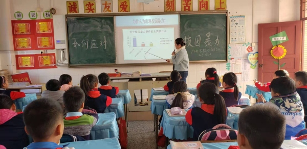 各班通过图片、视频、文字等展示,首先让学生认识什么是校园欺凌.一些同学在遭遇校园暴力、生命安全受到威胁时却全然不知,以为校园暴力仅仅是不礼貌行为;另一些同学在目睹校园暴力时也无动于衷,以为只是同学间的“嬉闹”。要抵制校园暴力,首先要具备对校园暴力的识别能力。要学会正确处理同学之间的关系,要友善相处,若遇到欺凌纠纷、摩擦要学会保护自己,及时报告老师和家长,或者通过正常的程序和法律途径,来维护自身的权利,妥善处理矛盾,其次,重点教育学生,如何提高抵制校园欺凌的意识,如何正确应对校园欺凌,在校园欺凌中怎样保护自己等方面进行重点教育。最后再通过案例分析,让学生了解校园欺凌带来的危害,让同学们拒绝暴力,做个健康阳光的学生。课后各班还把预防校园暴力编制歌谣和口诀让学生唱,读,学生读的朗朗上口,牢记心中。
