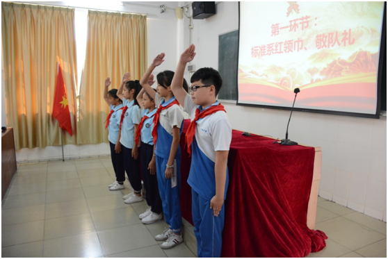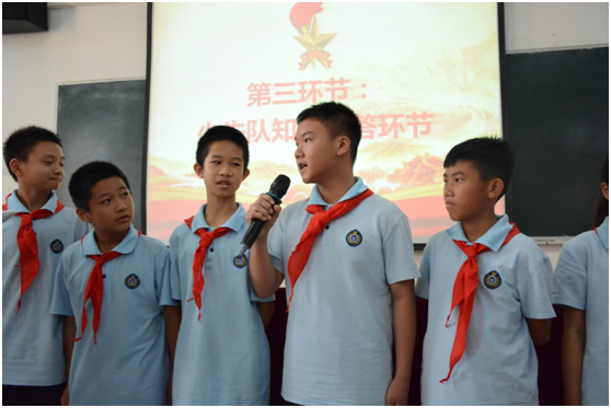 比赛中,各参赛中队分别以标准佩戴红领巾和敬队礼、出退队旗以及少先队知识竞答三个环节进行激烈角逐。各参赛队员们严格按照比赛标准的要求展示自己的佩戴红领巾、敬标准队礼以及出退队旗的实力。少先队知识竞答环节,台上参赛队员们的精彩竞答,更是赢得台下的阵阵掌声。