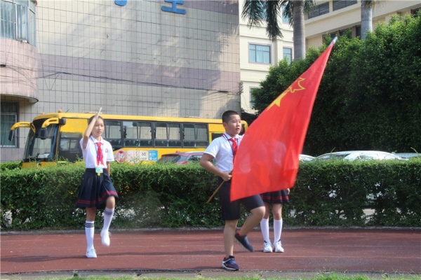 新长江庆祝建队70周年的主题仪式活动在朝气蓬勃的《出旗曲》中拉开了帷幕。三名大队委踏着坚实的步伐出队旗,操场中的少先队员们向队旗敬队礼,整个出旗仪式庄重而严肃。随后七年级二班的大队委林夏锡走上旗台指挥所有少先队员唱队歌。