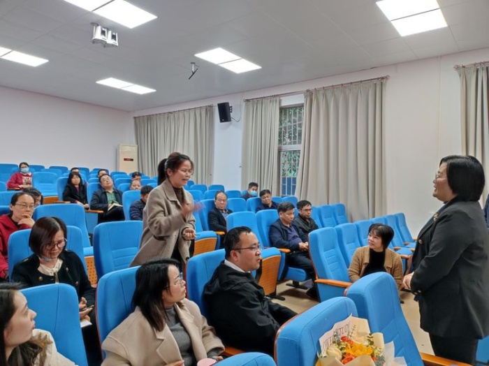 在一片热烈的掌声中,语数英分别开展了教学讨论会。在会议中,老师们积极发表自己的意见,互相交流、探讨,刘瑜老师,陈少丹老师、唐海凤老师也分别传递了自己的教学理念、教学方法,给予了石坝中心小学老师们自己教学的经验。为了更好地在教育教学的策略上帮助石坝中心小学,陈立主任根据石坝中心小学的实际情况,为老师们带来《如何落实低年级教育教学的策略》主题讲座。陈立主任向老师们介绍了体育路学校的教育宗旨、教学成果,同时,他根据学校“三段一体目标导向”,认为小学低段应注重培养学生的兴趣+习惯+思维。他讲道,低年级是培养孩子学习兴趣的关键期,也是培养良好学习习惯的关键期。对于低年级孩子学习思维的培养,要引导自主探究,拓展学生思维的广度;巧妙设置问题,发掘学生思维的深度;尊重学生,培养学生思维的独创性,让教育教学有实效。在陈立主任的分享后,老师们都颇有收获。针对低年级教育教学的策略,陈立主任和石坝中心小学的老师们继续深入讨论,仔细研讨,共同为培育孩子学习兴趣、习惯、思维出谋划策。