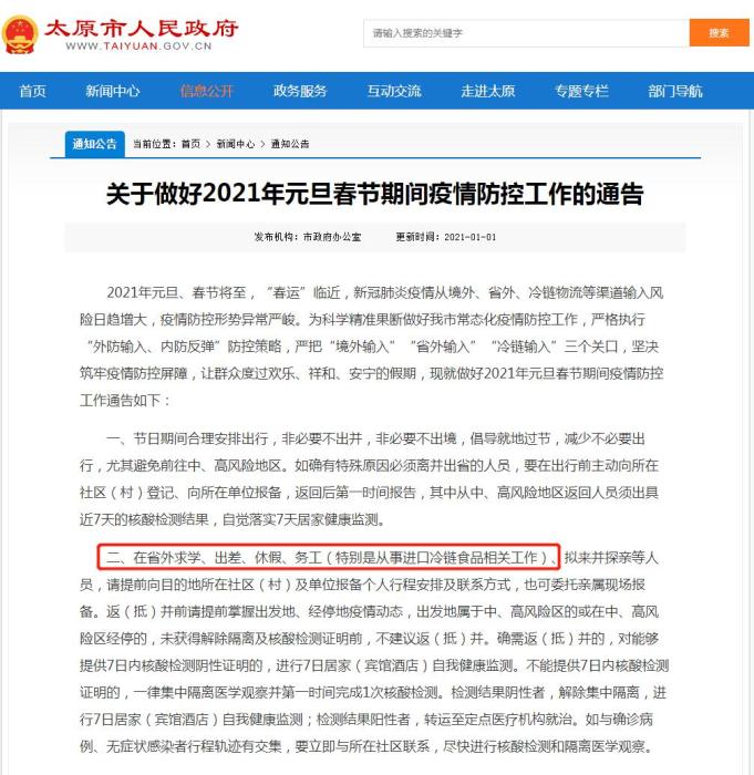如山西太原市要求,在省外求学、出差、休假、务工(特别是从事进口冷链食品相关工作)、拟来并探亲等人员,请提前向目的地所在社区(村)及单位报备个人行程安排及联系方式。