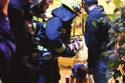 1月3日傍晚,一名男童头部被玻璃门夹住,消防员到场救援。(中山消防供图)