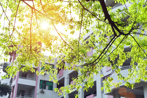绿树、校舍相映成辉