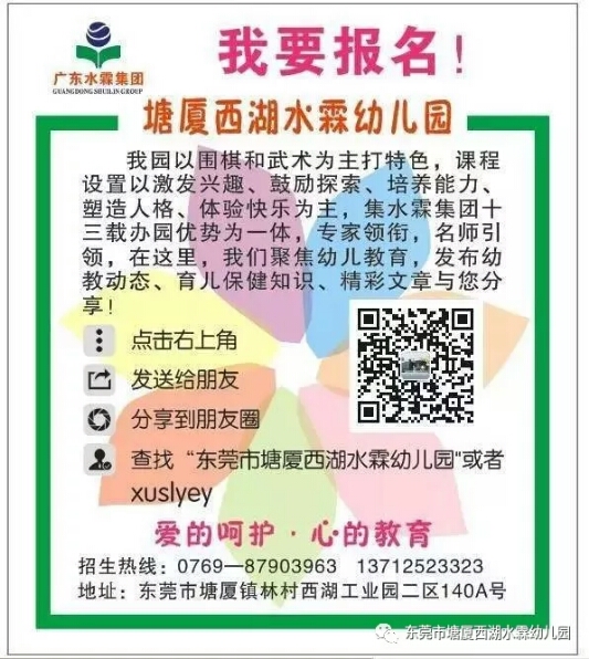 追求卓越品质、力创特色名园 园所介绍 水霖教育是由广东水霖集团投资的一所集幼儿园、小学、初中、高中为一体的高档学校,我园一直以来以“尊重生命,对孩子的一生发展负责,让孩子成为终生快乐幸福而有成就的人”为办园宗旨,不断地追加各项硬件设施设备的投入,以“健康活泼、睿智豁达”为培养目标,打造一所高起点、高配置、符合时代发展、适应社区要求的高质量幼儿园。连续五年获得塘厦镇先进民办幼儿园一等奖。现面向社会招生开始了! 园所环境 塘厦西湖水霖幼儿园于2010年5月经东莞市教育局批准创办一所民办幼儿园,幼儿园位于东莞市塘厦镇林村西湖工业园二区140A。2012年12月被评为东莞市市一级幼儿园,东莞市普教系统文明单位、东莞市首批《指南》实验园、东莞市优秀民办幼儿园、连续5年评为塘厦镇先进民办幼儿园一等奖等荣誉。开园来在市和镇教育局举办的舞蹈、讲故事、绘画等各类比赛中分别获得一、二、三等奖的好成绩。有着经验丰富、市一级幼儿园管理经验的园长和行政团队管理,教职工队伍严格按照市一级幼儿园的要求配备,是塘厦镇一所高起点、高档次的现代化品牌幼儿园,志力于打造塘厦的学前教育示范基地,成为民办教育的领头羊。 室内场地 蒙氏室 美术室 图书室 二楼楼梯拐角 三楼楼梯拐角 围棋室 教室区域 大班教室 户外场地 星空体育的团队 高祥林 塘厦镇名园长 毕业于华南师范大学,从事幼教行业16年、在西湖水霖幼儿园担任园长职务8年、荣获“镇名园长”、“优秀教师”、“先进教育工作者”等,具有较强的组织协调能力,以超前的意识、智慧和胆略,带领园所走特色办园和内涵发展之路,使幼儿园获得了可持续的发展,享有良好的园所形象和社会口碑,成为东莞市先进民办幼儿园、东莞市一级幼儿园。 陈静 教学园长 本科学历,从教13年,负责幼儿园的教育教学、幼儿园的特色、第二课堂、师资队伍建设等。多次荣获塘厦镇“名教师”、“优秀教师”等称号。 陈霞 园长助理 毕业于咸宁师范大学,大专学历,从事学前教育教学16年,主要负责全园的人事、家园联系、各类学籍平台、员工团队建设 熊燕 后勤主任 毕业于广东茂名学院,大专学历,从教8年,本学期负责管理园内的后勤、卫生保健工作、安全、校车的管理 特大喜讯 为充分发挥名师的示范辐射作用,激励幼儿教师专业化成长,塘厦镇开展了第二届“幼教名师”评选工作。经评审,我园高祥林园长、曾艳老师分别被评为“名园长”、“名教师” 2019年“名园长”、“名教师”合影留念 有趣的活动 体能大循环 星空体育的荣誉 幼儿园从2010年开办至今,分别荣获:东莞市一级幼儿园,东莞市普教系统文明单位,东莞市优秀民办幼儿园,连续5年被评为塘厦镇先进民办幼儿园一等奖,在塘厦镇教育部门举办的各类比赛中也取得很多好成绩。 孩子是家庭的希望,从出生的第一天开始,他们的健康和发展就牵动着每一位父母的心。就读西湖水霖幼儿园是您最好的选择!是孩子迈出了成功的第一步! 欢迎您加入西湖水霖幼儿园这个大家庭!