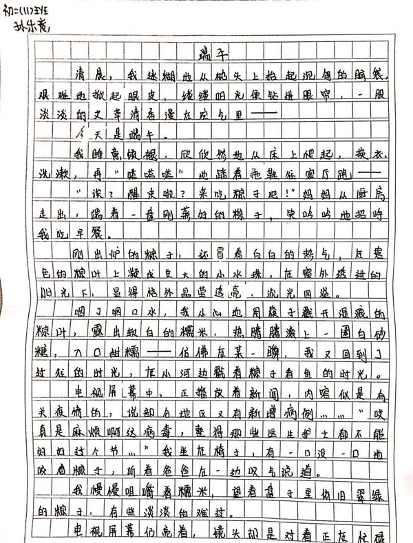这次端午节主题活动内容有:1、“粽子情,星空体育传”。要求初一级学生在2020年6月25-27(端午假期)在家里包一次粽子、制作香囊、挂艾草。2、“传经典,诵祖国”。要求初二级学生以端午节为主题,朗诵一首诗歌(视频拍摄)、写一篇抒情文章、书写一幅对联。初一、初二级各班都积极开展了“端午主题”活动,让学生感悟传统文化的魅力,接受中华悠久文明的洗礼和传统美德的熏陶,增强民族自豪感,用中华传统节日引领同学们诗意成长。