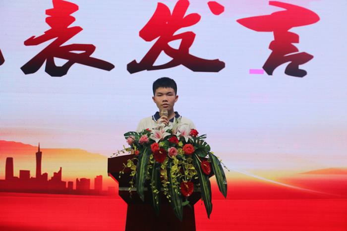 随后,九年(9)班廖家 同学作学生代表发言,他深情回忆:难忘晨读中的朗朗书声,难忘夜幕下的埋头苦读,难忘课堂上老师们充满智慧的生动讲解,难忘爱心义卖此起彼伏的叫卖声。点点滴滴,历历在目。他表达了心中的不舍和依恋,以及对学校和老师们真挚的感激之情。他号召同学们肩负起时代赋予的使命,青春赋予的使命,怀着对母校的眷恋,对同窗的不舍,满怀希望地追逐梦想,去奋斗。