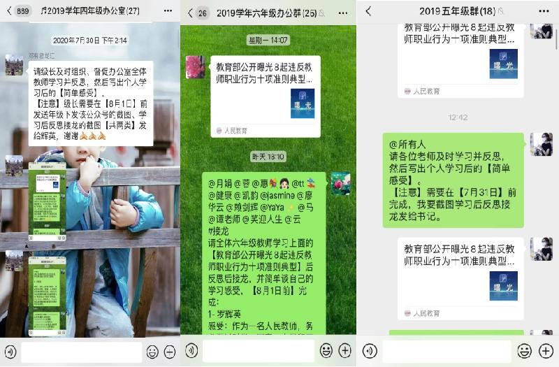 师者,以德为先”。高尚的师德师风是教师从事教育工作的灵魂。为了进一步加强教师队伍建设,不断提高教师职业道德素质和师德修养,保障全体教师在良好师德师风塑造和学习中的不松懈和持续性7月27-30日,在暑假期间,龙江城区中心小学组织全体教师在线上重点学习了“教育部公开曝光8起违反教师职业行为十项准则典型问题”一文,并进行了自我反思和学习心得的分享交流。