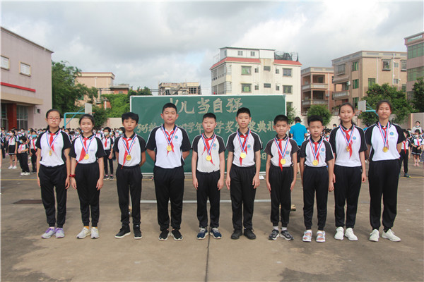 大会开始前,张敏灵老师宣读了获得“成学奖”名单,受表彰的同学满怀欣喜地依次走上领奖台。梁幸秋校长和王琼虹副校长,亲自为中高年级前10名及中低年级前15名的优秀学生颁发了“成学奖”奖牌,还为获得“五成学子”奖“德、智、体、美、劳”全面发展的学生颁发了奖杯,并与他们合影留念。在灿烂的阳光下,弼教学子胸前闪耀着光荣的奖章,手举着沉甸甸的奖杯,这一刻值得纪念!