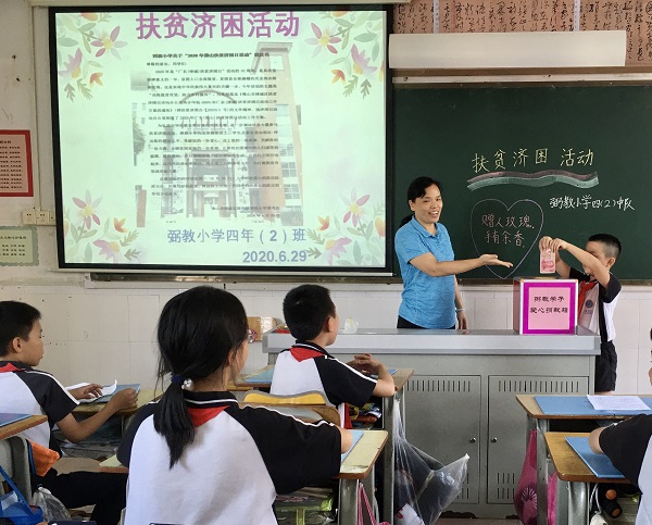 2020年6月28日,弼教小学大队辅导员张敏灵在校园广播及微信公号向全校师生发出倡议:伸出您的援助之手,奉献您的一份爱心,送上您的一份真情,贡献您的一份力量,点燃贫困家庭的一份希望,让那些在困难中的人们感受到温暖,得到帮助,早日摆脱困境,过上幸福的生活。倡议发出后,弼教小学师生踊跃参与,奉献爱心。