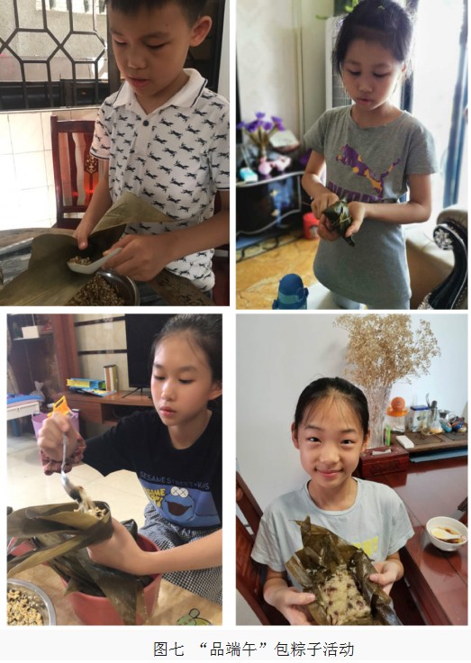 利用节假日,孩子们在家长的帮助下进行包粽子活动,别看他们个个年纪小,包起粽子来却是有模有样。除此之外,孩子们还参与了挂艾草、观看赛龙舟、洒雄黄酒、画额、炒午时盐等具有闽南泉州端午节日习俗的活动。亲子合力包粽子活动既锻炼了孩子们的动手能力,又让他们感受到了端午节独有的传统习俗,也增进了亲子关系,通过实际操作、亲身体验,不仅感受到了传统节日的特色魅力,更把节日的气氛推向了高潮。