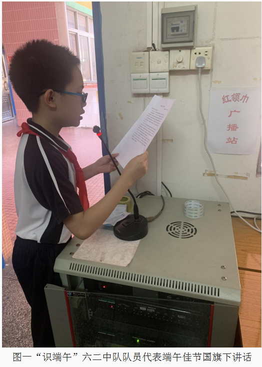 周一升旗仪式中,六二中队队员代表进行了关于传统文化端午佳节的国旗下讲话。本次讲话主题鲜明,不仅让广大少先队员深入了解和感受了中华传统节日文化的博大精深,提高了队员们学习传统文化的意识,增强了民族自豪感,激发了他们的爱国主义热情。