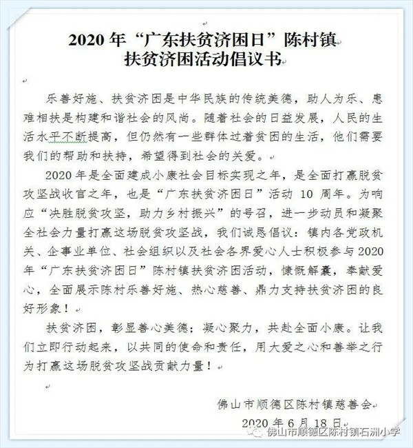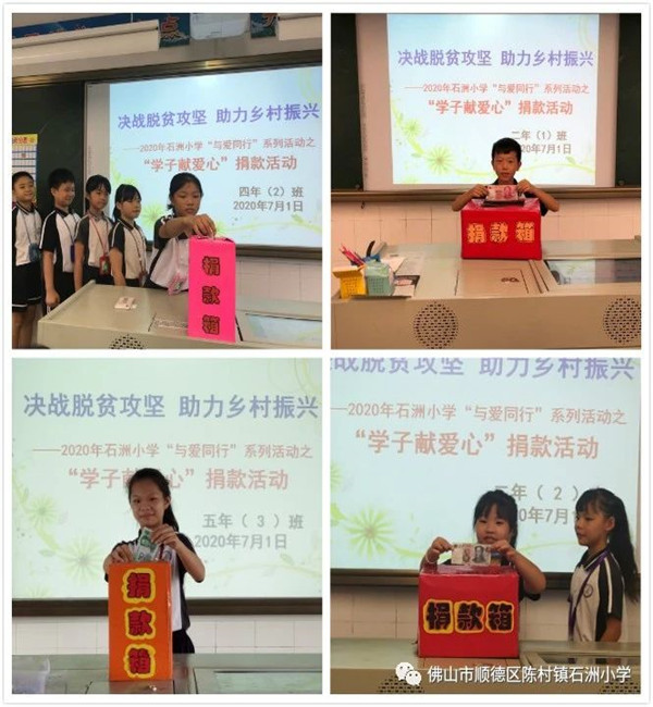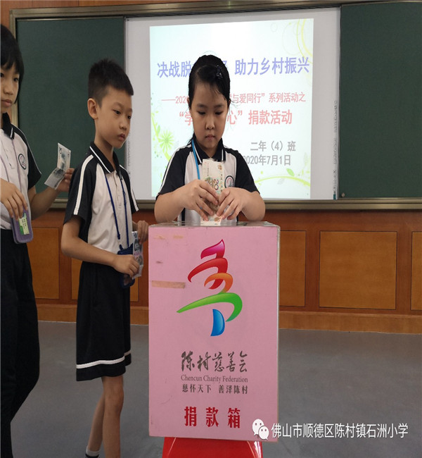 为结合2020 年广东扶贫济困日活动,广泛发动社会各界积极参与扶贫济困活动,并将募捐资金重点用于精准扶贫精准脱贫及乡村振兴工作,在活动中培养学生关爱他人、乐于奉献的良好品质。6月下旬,石洲小学开展“决战脱贫攻坚,助力乡村振兴”爱心捐款活动。