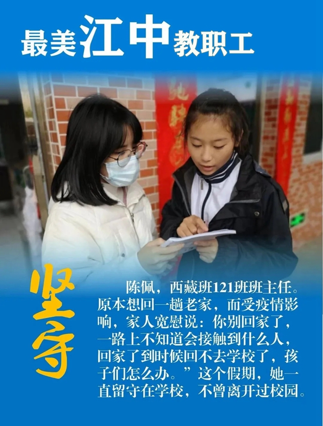 2020年,一场突如其来的新型冠状病毒肺炎疫情席卷了整个中国大地,社会上人心惶惶,战“疫”随时爆发,全国人民整装待发。作为西藏班班主任的陈佩老师,放弃了过年轮休的机会,毅然决然投身到学校抗“疫”的工作中,成为江中守护人。每天坚持巡查宿舍,确保孩子们的安全;积极配合校医的工作,每天亲自排查孩子们的健康状况;安抚疫情期间前来校区的家长,减缓家长对孩子的思念。
