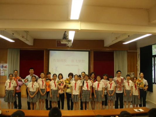 毕业典礼的高潮在谢师献花中到来,两个班级的学生代表为一群知识广博、耐心细致的科任教师献上献花,深情拥抱中,不少老师和学生都已眼眶湿红。