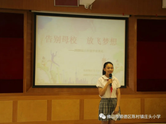 毕业典礼由我校黄晓芳副主任主持。典礼伊始,全体六年级师生观看了由两个班级班主任精心制作的毕业视频,一帧帧,一幕幕,所有的时光碎片,都是这个毕业季珍贵的影像。看着自己从稚嫩天真的孩童到日渐成熟,青春活力的少年,看着六年活动里的师生同心和欢声笑语,在场的同学感触良多,有的还偷偷抹掉了眼角的泪水。随后,六年二班的陈佳玲同学作为毕业生代表发言,表达了全体毕业生对母校和老师们的感谢,也立志将来要做成为母校骄傲的社会栋梁。接着,进行毕业证书颁发仪式,全体行政和六年级科任教师为六年一班、六年二班学生分别颁发证书,并为学生送上毕业祝福,毕业生们也用自己班级响亮的口号表达心中的感激之情。
