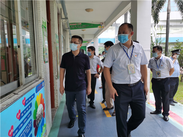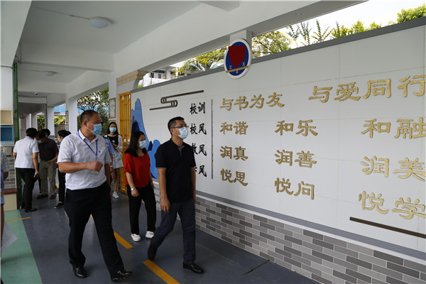 容镇长一行首先巡视了学校“和美”的校园生态环境。在绿树浓荫下,容镇长赞叹学校绿化面积大,课室明亮整洁,为陈村学子创设了健康舒适的学习场所。容镇长一边巡察校园,一边详细询问学校开学的准备工作,了解疫情防控措施等情况,他充分肯定了学校各项工作做得细、做得实,也为教师们送上了新学期祝福。