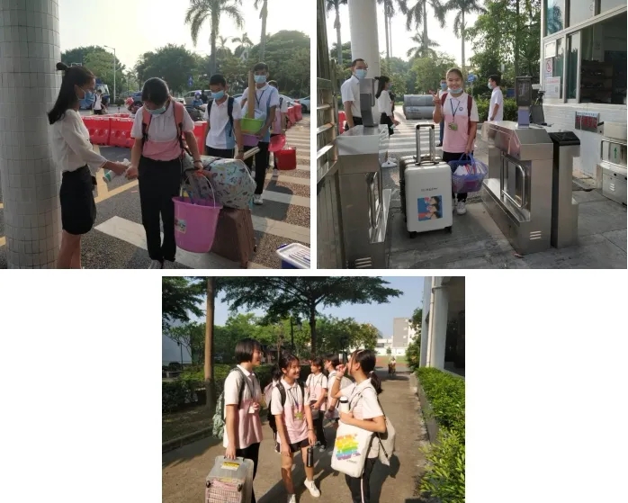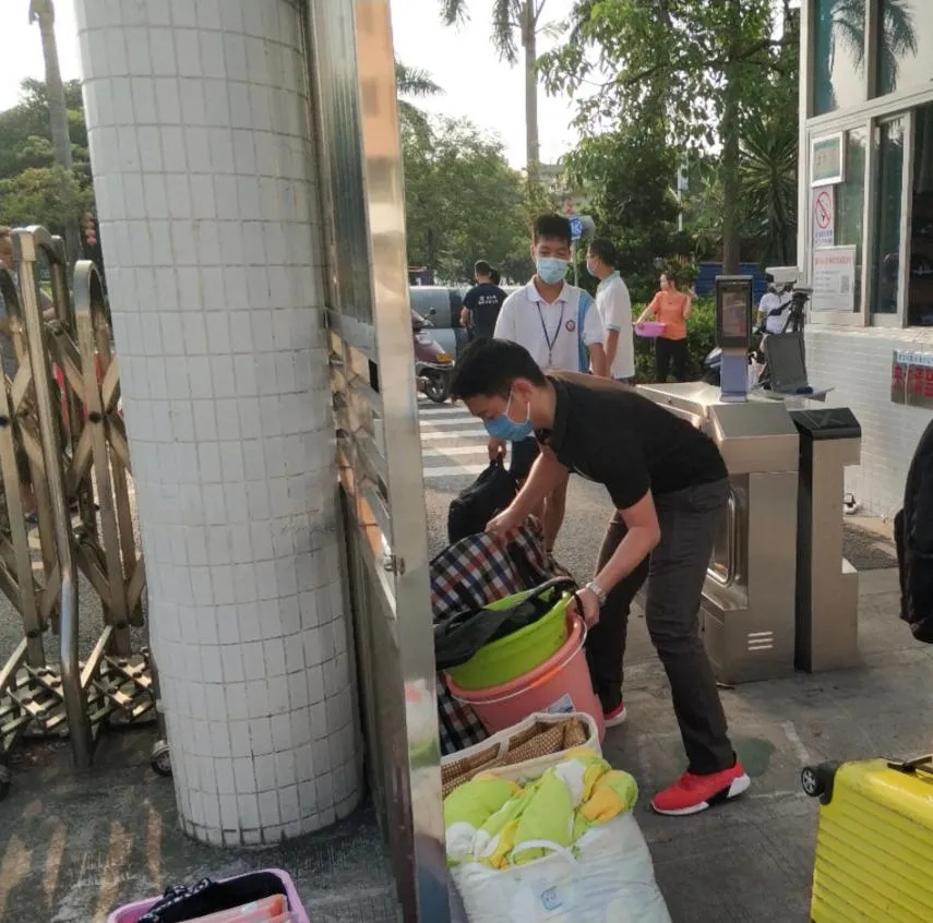 学校行政帮助住宿学生搬运行李,初三级家委前来协助教师维持学校路段秩序,为返校学子创造安全通畅的道路环境。