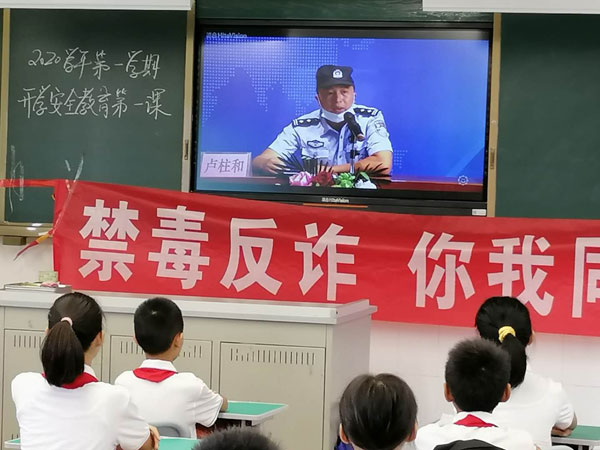 接着,由学校法制(禁毒)副校长陈村旧圩合成警务区卢柱和警长给全体师生上了一堂主题为“禁毒反诈,你我同行”的法制安全教育课。卢柱和警长通过案例,深入浅出的讲解,就“防溺水”、“交通安全”、“禁毒”、“防诈骗”等方面的安全问题和同学们进行了深入交流,他希望全体师生加强安全宣传教育、提高个人思想素质、养成良好习惯、加强自我防范、珍惜时光,从规范做起,从我做起,为争创安全文明校园作出贡献。