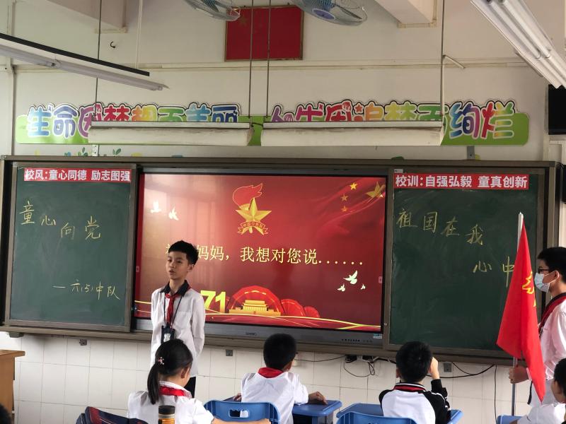 紧接着,各中队组织开展了“童心向党,祖国在我心中”主题中队活动,通过“向国旗敬礼”、“我为祖国妈妈唱首歌”、“学习新中国史”等形式多样,内涵丰富的活动,共庆祖国71华诞。在中队活动中,队员们认真了解新中国发展史、齐唱爱党爱国红歌,各小队还以朗诵、演讲、歌唱等多种形式来表白祖国,歌颂祖国,为祖国妈妈送上自己的一份生日祝福。
