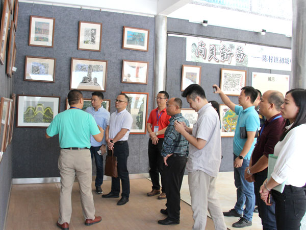 复评工作组一行在校长谢文忠校长、李日和副校长的陪同下,饶有兴趣地察看了陈村镇初级中学版画宣传展板,并在展板前驻足停留,详细询问陈村镇初级中学“版画特色”办学情况。广东省版画名师工作室的彭产兴老师结合展板图片,从版画创作情况、版画氛围的营造、版画校园文化的布置、版画图书的购置、以及版画各种活动及所取得的成绩等方面做了简要的汇报。随后,复评工作组一行巡视了版画文化长廊,深入察看版画工作室、查阅版画资料对学校的版画文化艺术传承工作进行了综合评估。总结会上复评工作组专家对学校版画传统文化艺术传承工作给予了高度评价,并对学校版画建设工作的开展提出了专业的指导。临行之前,复评工作组一行表示,陈村镇初级中学“版画特色”建设卓有成效,希望陈村镇初级中学再接再厉,通过“版画”建设,营造全校传承传统文化的氛围,弘扬中华传统文化,为学生的终身发展奠定坚实的文化基础。