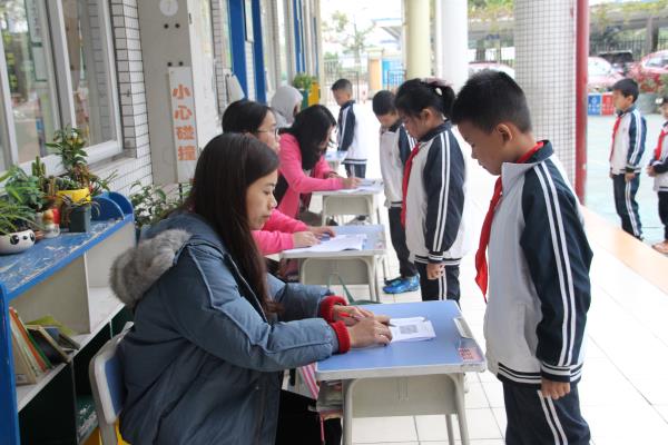 第二部分的考核在十六周一下午进行,语数英三科同时考核。三至六年级的考核形式是三科综合笔试,一、二年级则是通过各科组的评委老师到各班进行现场口语考查。寒意骤至,考核活动却是如火如荼地进行着,三至六年级的学生们端坐在教室里奋笔疾书,一、二年级的小朋友们则在所有考核老师的组织下,有的在课室认真聆听故事;有的在老师指挥下排着整体的队伍;有的在不同学科的老师面前奶声奶气地回答着各科的问题。稚态可掬的口述,还不忘礼貌地问好,配上那可爱的笑容,又是“素养”的另一道风景。
