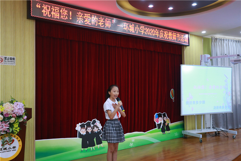 9月10日当天,大队部组织全校师生,在五楼多媒体室进行庆祝教师节仪式活动。早上8:20,两位可爱的小主持开场后,学生代表――陈璨璨同学作专题讲话,她称赞老师们是“最可爱的人!”,祝愿老师们节日快乐,身体健康,桃李满天下!