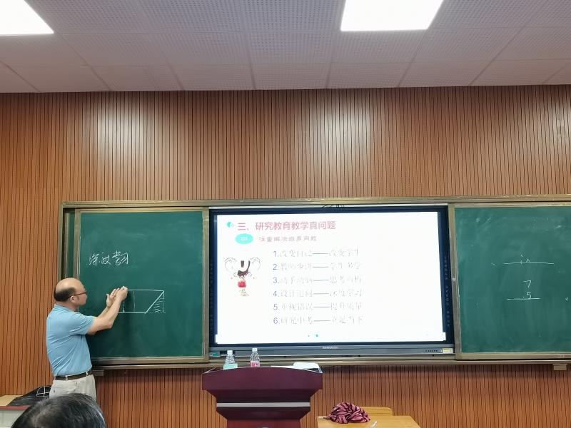 第二部分,邓老师为所有的数学老师们开展了以“研究教育教学真问题”为主题的专题讲座,特别提到三个方面:(一)是研究教材备好课,建议老师们从6个方面去研究,编者意图,知识技能,前后联系,教育价值,学生情况,学法教法,讲到教法时,还展示了今年的中考题,以具体的题目来亲自示范,对于他提到的方法,让老师们大开眼界;(二)注重解决自身问题,从6个方面给老师们提供了很好的建议,改变自己,教师少讲,动手动脑,设计追问,重视错误,研究中考;(三)科研课题从哪里来?从教育教学实际问题中来,从各级各类课题指南中来,从他人课题名称中来。无论是哪一方面,邓老师讲的都很接地气,老师们都听得非常认真,收获很多。