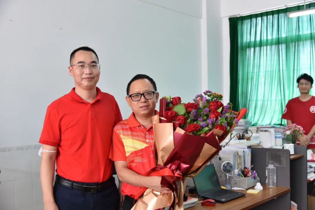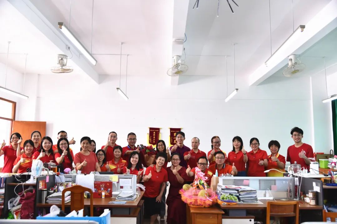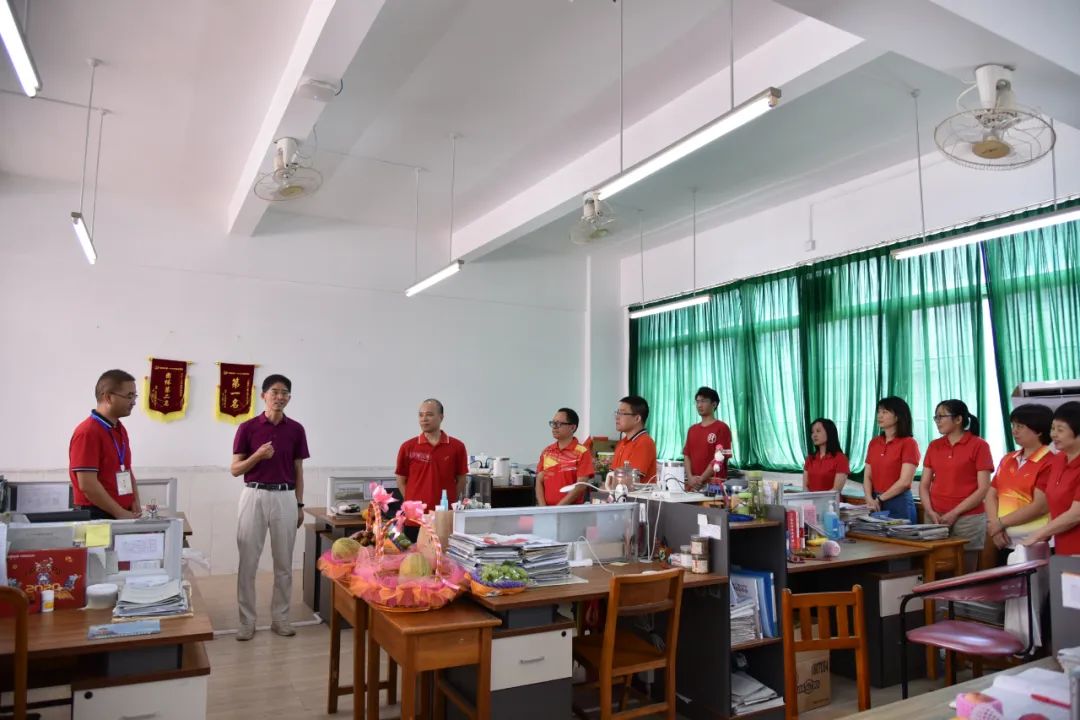 区领导与我校行政在成功门前留影,预祝中考胜利!在白建元副校长及陈水绎副校长等的陪同下,张毅副局长一行来到初三教师办公室为初三老师送上寓意“硕果累累”的夏日水果及寓意“大红大紫、好事连连”的鲜花,并与老师们进行亲切交流。