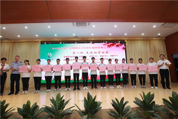 特殊时期的特殊学期,在线下复学的两个月后迎来了特殊的散学礼,2020年7月17日上午,陈村职业技术学校举行了线上线下相结合的2019学年第二学期期末总结表彰暨散学典礼,主会场设在综艺楼报告厅,分会场是各班教室,主会场的盛况通过网络直播现场分享到各个分会场。 陈村镇消防中队队长、陈村职校消防校长程巍,学校全体行政、教师及学生代表在主会场观礼。 散学典礼由司徒葵东副校长主持,在雄壮的国歌声中拉开帷幕。