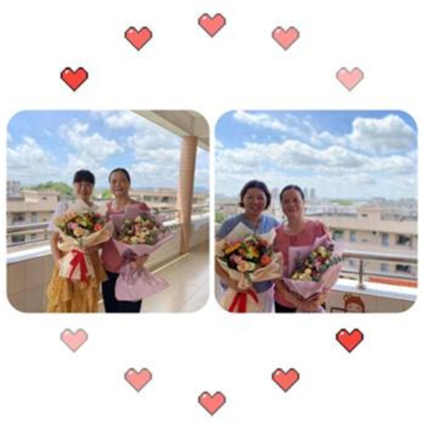 (图为青年教师代表为吕老师、周老师献上鲜花)