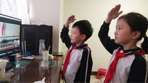 伴随着雄浑激昂的国歌,鲜艳的五星红旗在罗沙校园冉冉升起。升旗台前,老师们衣着端庄,队列整齐;电脑、手机屏幕前,师生、家长们神情庄严肃穆,行礼,全体同时齐唱国歌。