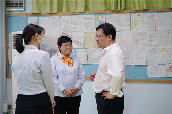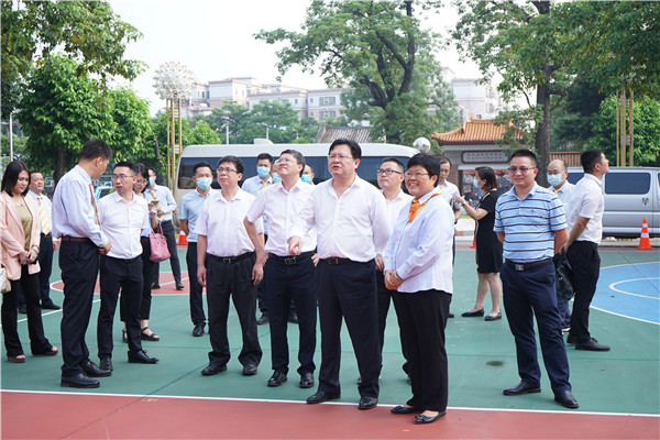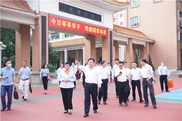 8月31日下午,佛山市副市长许国、市政府副秘书长邓灿荣、市教育局二级调研员李忠、顺德区副区长蔡伟、顺德区教育局党组书记陈宇莹、容桂街道党工委副书记、街道办事处主任欧胜军、顺德区容桂街道党工委委员欧阳雪乔、顺德区教育局基础教育科科长陈永刚等市、区领导到容山中学检查秋季学生返学工作。